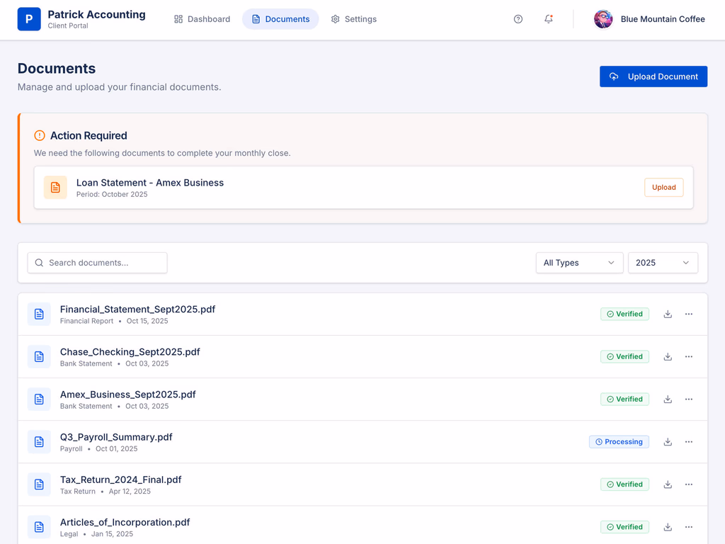 With clear status and missing-item tracking, tax deadlines, monthly closes, and reporting cycles stop feeling like a scramble. Teams can see what’s truly blocked and act early.