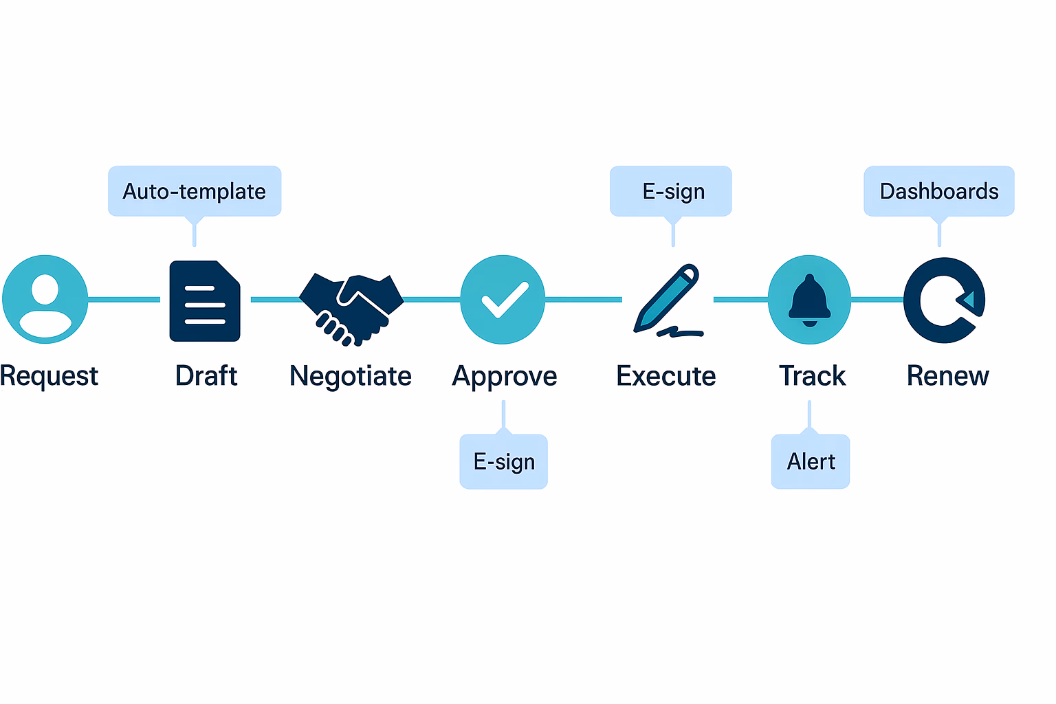 A contract management workflow is the structured process that defines how a contract moves from request to approval to renewal.